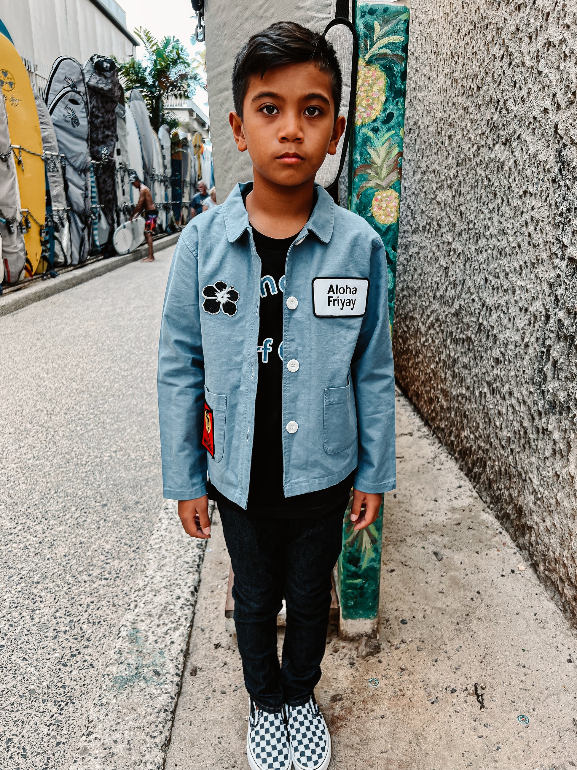 - Custom patches of Aloha Friyay, Hawaii sunset surf, black hibiscus, and monstera leaf